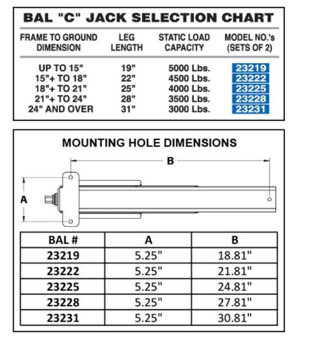 Details: Introducing the latest product innovation from BAL to meet the needs of RVers: the new BAL "C" Jacks, combining the strength of a leveling jack and the steadiness you get from a stabilizing jack. Designed for use with travel trailers and fifth wheel trailers, there's no comparable product like the "34C" Jack. Available in 22", 25" v extension and shipped in a boxed set of two with crank handle.
