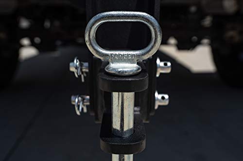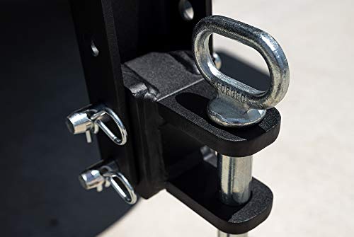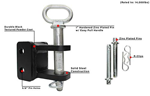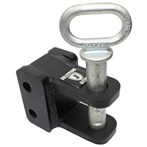 Details: The Medium Duty 2-Tang Clevis Attachment features a 1" pin and a 2-1/4" opening which allows connection to a Lunette Ring or a farm-style draw bar. This will allow you to tow farming equipment, pintle trailers, even chains and straps! This attachment is built with solid steel and is coated with our signature black textured powder coat, just like the rest of our hitches and accessories. This product includes a 1" zinc plated pin with a large handle and two of our standard 5/8" hardened pins. Compatible with all BulletProof Hitches. Rated to 14,000 lbs.