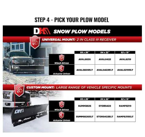 DK2 personal snow plows allows you to quickly and effectively remove snow from your driveway or small parking lot. The 84 in. x 22 in. DK2 plow simply slides into a 2 in. front mount receiver for easy removal and storage. Each plow ships in a single carton complete with hardened steel cutting edge scraper, rubber snow deflector, plow markers, skid shoes, castor kit for easy storage, and a IP67 wireless electric actuator. Each snow plow will also include a set of adjustable blade stiffeners for added strength by creating a 3 point connection. Fits any vehicle that has a 2 in. Class III front mount receiver (not included) 1-Year Warranty.