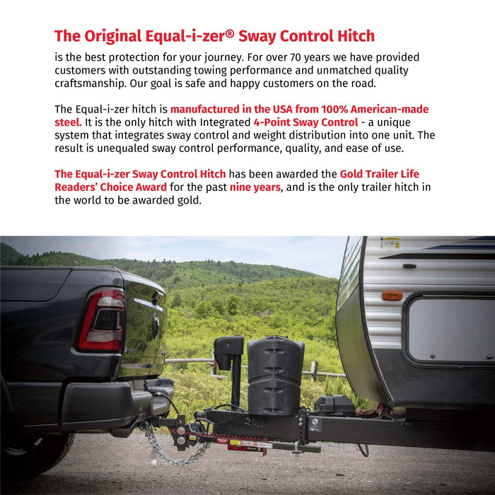Details: The Equal-i-zer hitch’s integrated 4-Point Sway Control™ resists more sway than any hitch on the market, making it the best performing weight distribution hitch. Trailer owners across the country have voted the Equal-i-zer hitch the #1 hitch on the road for six consecutive years.The 90-00-0400 Equal-i-zer hitch offers a 400 lb. maximum tongue weight and a 4,000 lb. maximum trailer weight. The shank allows a 3" drop and a 7" rise, measures 12" long, and fits 2" trailer hitch receivers. For over 70 years we have been keeping families safe on the road. The Equal-i-zer hitch’s integrated 4-Point Sway Control™ technology provides the safest towing possible and is backed by a lifetime warranty. Over 99% of our customers recommend the Equal-i-zer hitch to their friends, and our hitch has received national recognition for superior sway control and weight distribution. Every hitch is built from the highest-quality American steel, by people who care about your safety and take pride in their work. Whether you pass a semi-truck, experience gusty winds, or have to make a quick maneuver, our hitch will ensure your trailer stays right behind you, protecting both your trailer and your family.The Equal-i-zer hitch eliminates the need for add-on sway control devices and the hassle that goes along with them. With an Equal-i-zer hitch you don’t have to worry about restrictions on backing up or a tight turning radius. There’s nothing extra to hook up or take off. When the weight distribution is engaged, the sway control is engaged too, providing your family the best protection possible.