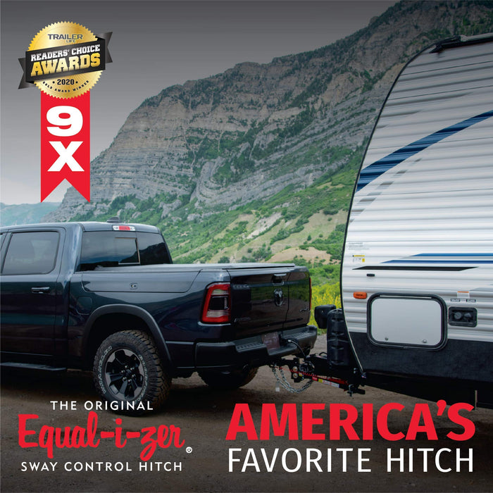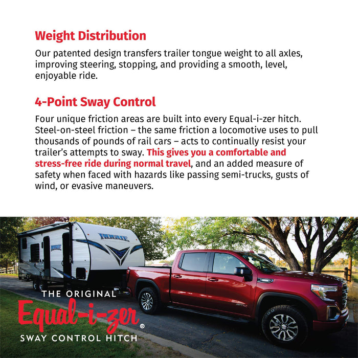 Details: The Equal-i-zer hitch’s integrated 4-Point Sway Control™ resists more sway than any hitch on the market, making it the best performing weight distribution hitch. Trailer owners across the country have voted the Equal-i-zer hitch the #1 hitch on the road for six consecutive years.The 90-00-1600 Equal-i-zer hitch offers a 1,600 lb. maximum tongue weight and a 16,000 lb. maximum trailer weight. The shank allows a 3" drop and a 7" rise, measures 12" long, and fits 2.5" trailer hitch receivers. For over 70 years we have been keeping families safe on the road. The Equal-i-zer hitch’s integrated 4-Point Sway Control™ technology provides the safest towing possible and is backed by a lifetime warranty. Over 99% of our customers recommend the Equal-i-zer hitch to their friends, and our hitch has received national recognition for superior sway control and weight distribution. Every hitch is built from the highest-quality American steel, by people who care about your safety and take pride in their work. Whether you pass a semi-truck, experience gusty winds, or have to make a quick maneuver, our hitch will ensure your trailer stays right behind you, protecting both your trailer and your family.The Equal-i-zer hitch eliminates the need for add-on sway control devices and the hassle that goes along with them. With an Equal-i-zer hitch you don’t have to worry about restrictions on backing up or a tight turning radius. There’s nothing extra to hook up or take off. When the weight distribution is engaged, the sway control is engaged too, providing your family the best protection possible.